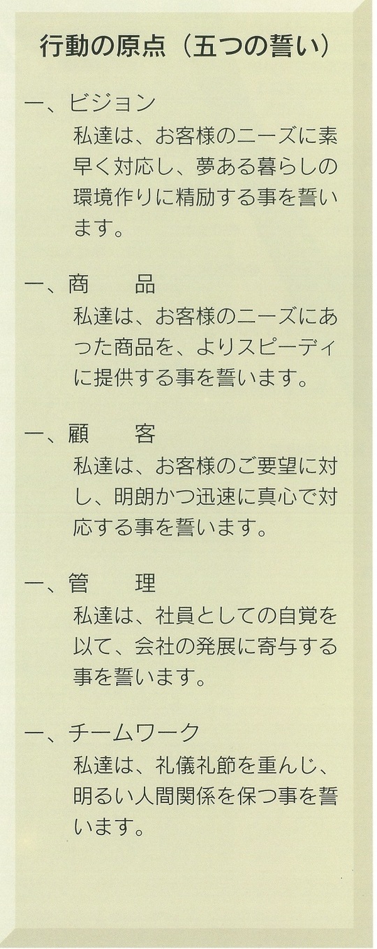 平成5年に完成しました合志配送センターは物流の合理化を図り、業界西日本トップクラスの倉庫です。これからは、さらに先行く次代に向けての”人財づくり”、”魅力ある会社づくり”をモットーに、お得意先、仕入先、社員が共に繁栄する企業になれるよう邁進していく所存でございます。今後とも一層のお引立てを賜りますよう、よろしくお願い申し上げます。